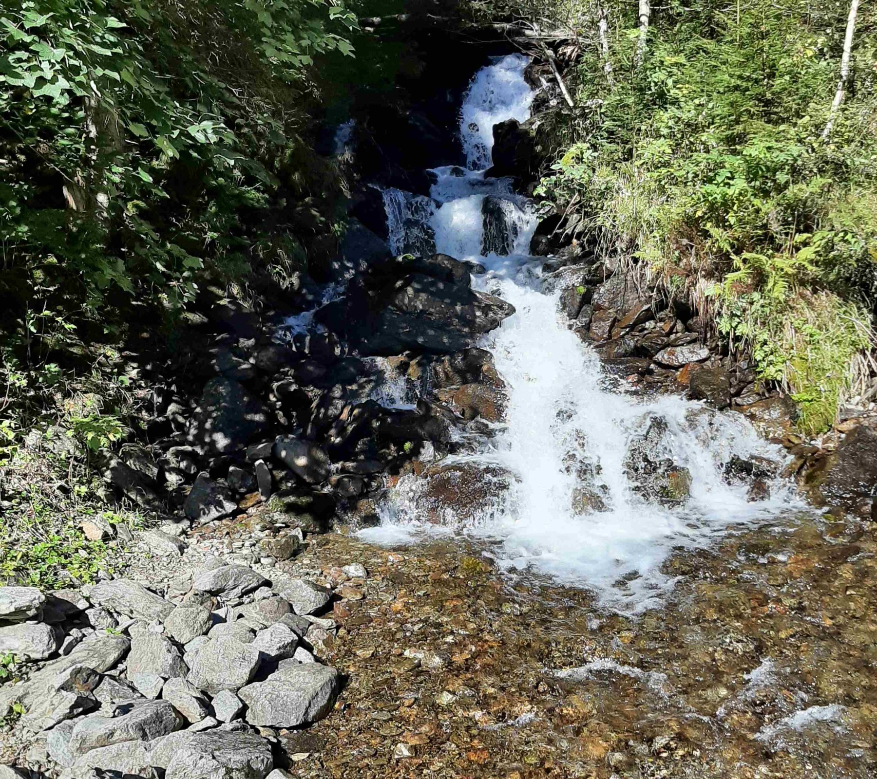 Vom Parkplatz bei der Eschachalm im Obertal nehmen wir den Steig. Über einen Wasserfall ergießt sich der Duisitzkarbach rauschend in den Obertalbach. Bis zu den Saghütten ist der Steig steil, aber nicht schwierig.